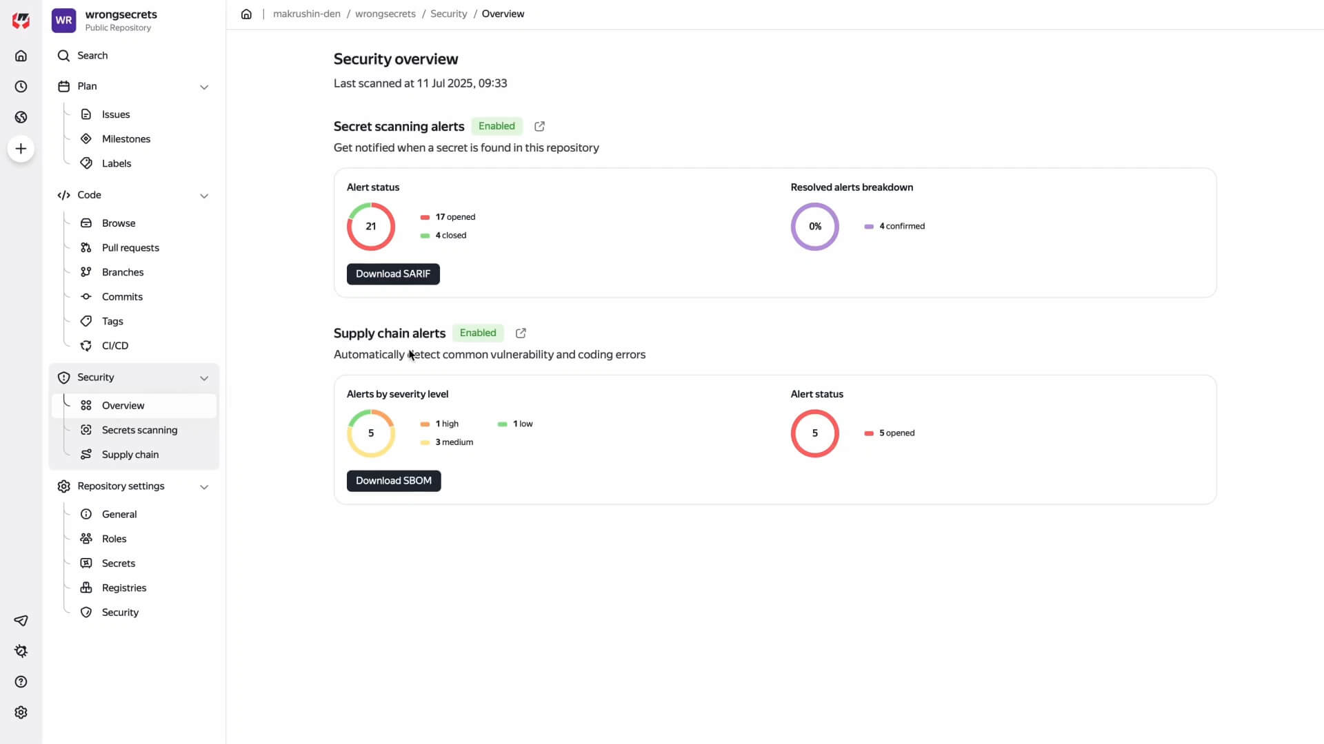 В разделе Security собрали сканер чувствительных данных, анализ безопасности зависимостей (Software Composition Analysis) и сводную статистику по найденным проблемам