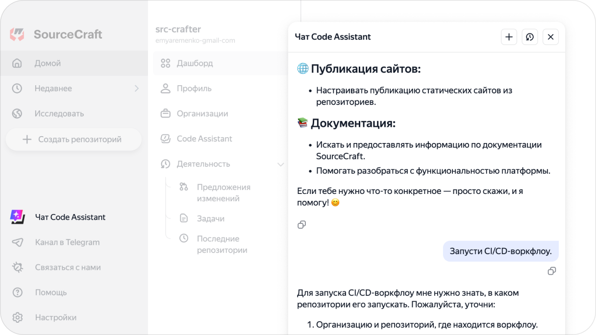 Протестируйте на платформе встроенный чат Code Assistant, создавайте с его помощью репозитории по шаблонам или с нуля, управляйте файлами и папками, работайте с кодом и запускайте-CI/CD процессы. Кроме того, с помощью AI вы можете публиковать статические сайты, собирать телеграм-ботов, изучать документацию и работать с задачами.